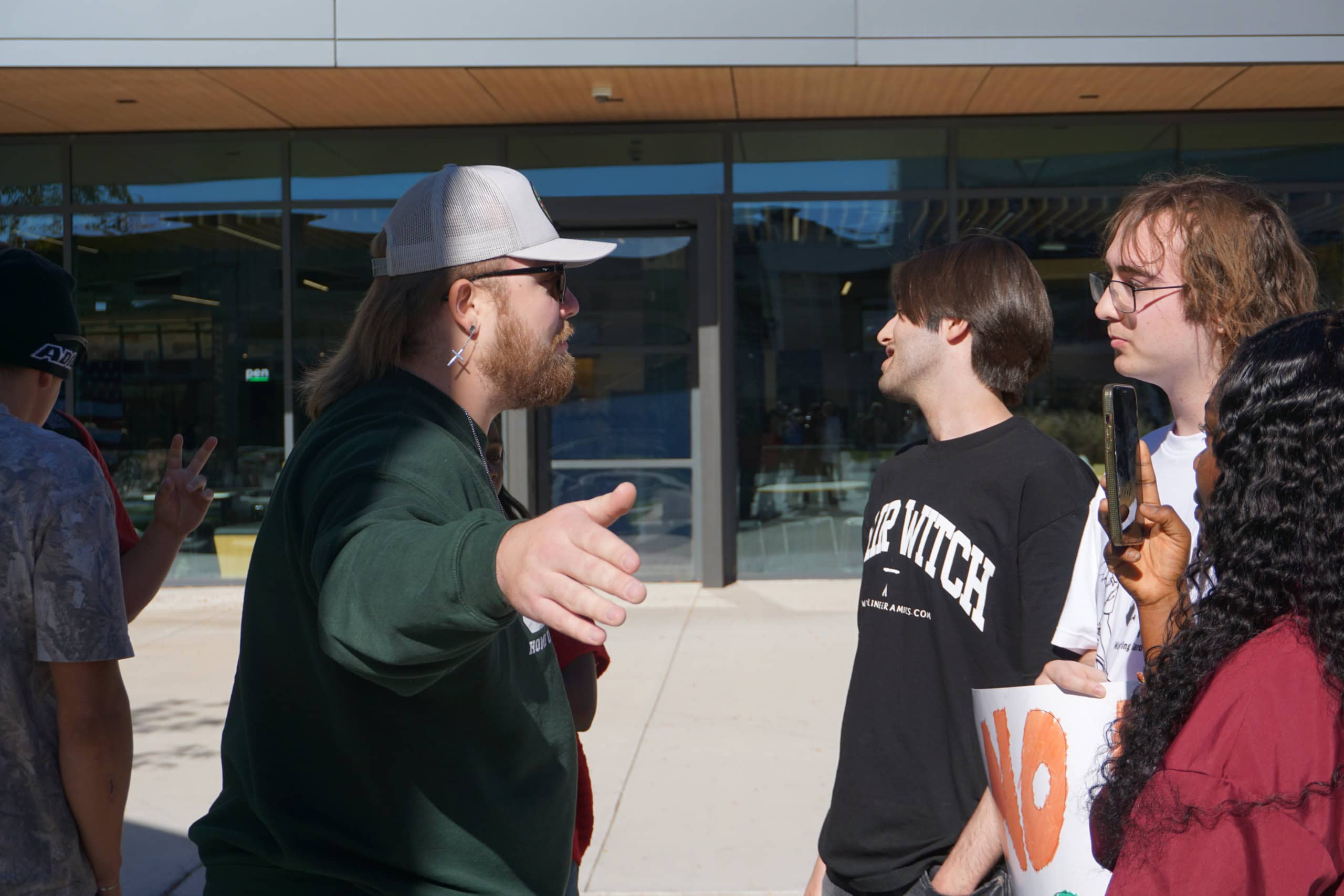 Ben DuBerevac debating Students for Democratic Society Club Presidents Kareen Kasem and Collin Grannis | Photo by: Matthew Franke, The UVU Review