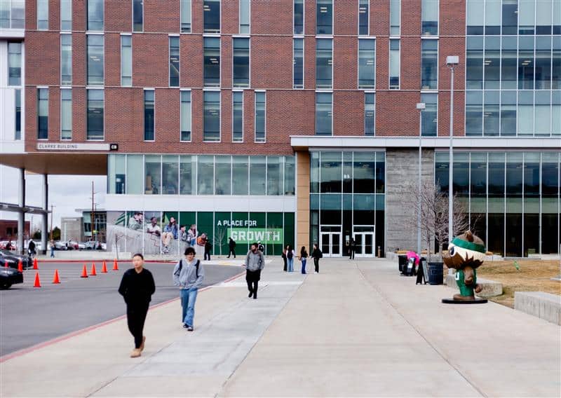 A groups of students walking in front of the Clarke Building at Utah Valley University
